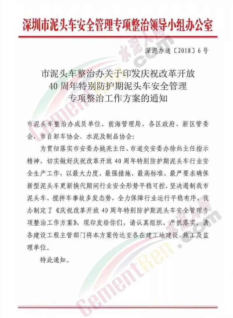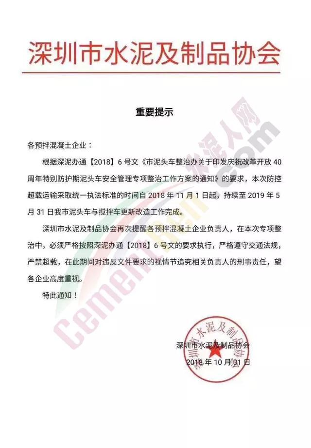 10月31日深圳市水泥及制品協(xié)會發(fā)布重要提示稱,根據(jù)深泥辦通【2018】6號文《市泥頭車整治辦關(guān)于印發(fā)慶祝改革開放40周年特別防護(hù)期泥頭車安全管理專項(xiàng)整治工作方案的通知》的要求,本次防控超載運(yùn)輸采取統(tǒng)一執(zhí)法標(biāo)準(zhǔn)的時間自2018年11月1日起,持續(xù)至2019年月31日,深圳市泥頭車與攪拌車更新改造工作完成。