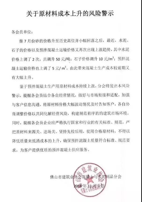 水泥行業(yè)在短短的一個(gè)月的時(shí)間內(nèi),一百多家水泥企業(yè)發(fā)布了幾輪漲價(jià)通知,價(jià)格漲幅可觀,已經(jīng)造成部分地區(qū)出現(xiàn)停工現(xiàn)象。佛山市建筑業(yè)協(xié)會混凝土與水泥制品分會發(fā)布了《關(guān)于原材料成本上升的風(fēng)險(xiǎn)警示》文件,文件稱因近期水泥、石子價(jià)格及預(yù)拌混凝土運(yùn)輸價(jià)格上漲,混凝土企業(yè)生產(chǎn)成本大幅上漲,分會特發(fā)風(fēng)險(xiǎn)警示,提醒會員結(jié)合各自經(jīng)營情況,做好與市場銜接和適配,加強(qiáng)客戶信息溝通,將原材料價(jià)格大幅波動情況及時(shí)告知客戶。原文如下: