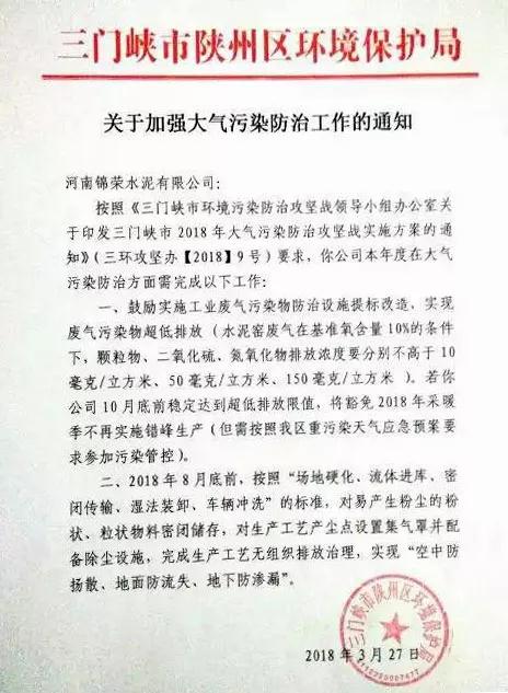 1.2018年3月,根據(jù)三門峽市物料堆場專項整治行動方案,陜州區(qū)環(huán)保局向河南錦榮水泥有限公司下達了治理通知,要求其于8月底前按照“場地硬化、流體進庫、密閉傳輸、濕法裝卸、車輛沖洗”的標準進行治理。
