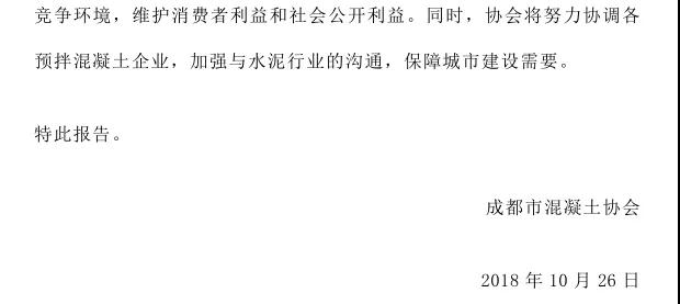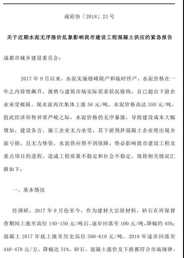 除此之外,成都市混凝土協(xié)會發(fā)布《關(guān)于近期水泥無序漲價亂象影響我市建設(shè)工程混凝土供應(yīng)的緊急報告》,該文件指出成都市水泥價格持續(xù)上漲,已經(jīng)嚴(yán)重影響到了民生,懇請建委能盡快協(xié)調(diào)經(jīng)委、發(fā)改委、物價局等相關(guān)部門,保障水泥供應(yīng)渠道暢通、價格合理,維護社會公平競爭環(huán)境,維護消費者利益和社會公開利益。