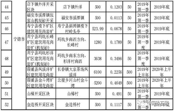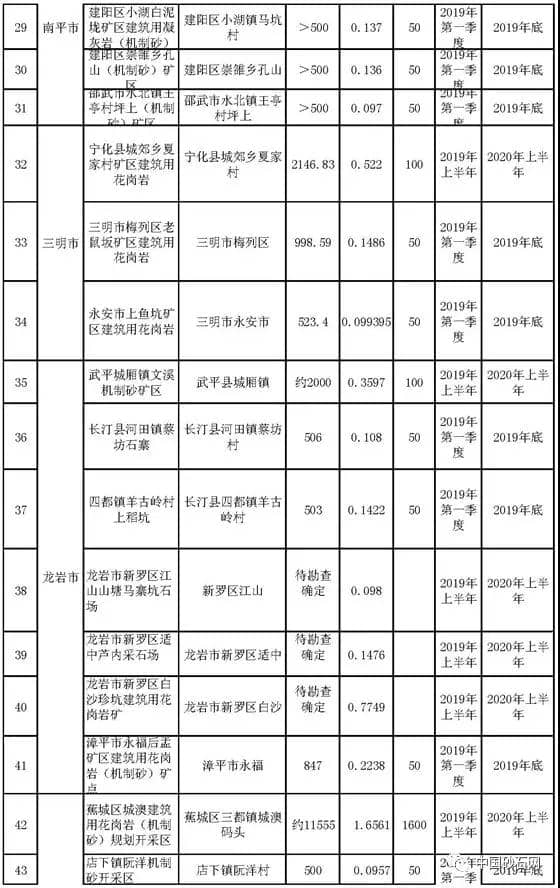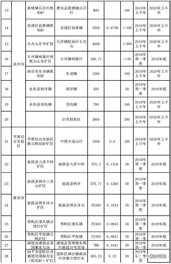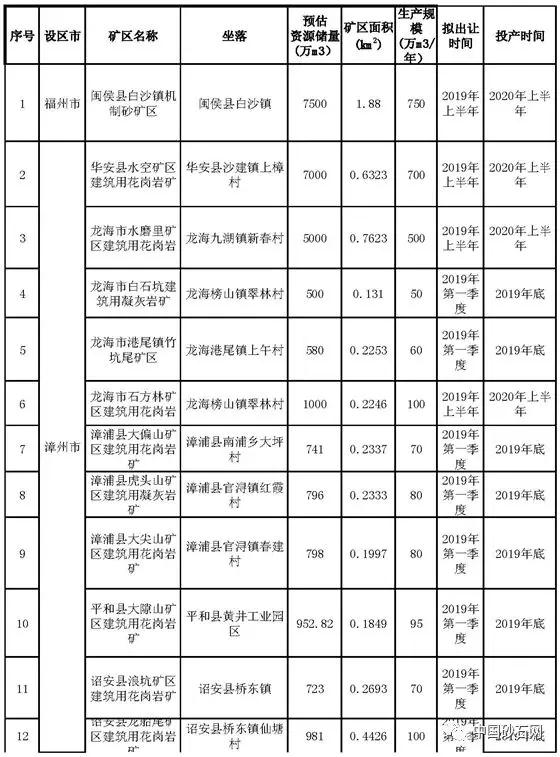 今天,《福建省國土資源廳 福建省住房和城鄉(xiāng)建設廳關于加快推進機制砂項目配套礦山采礦權出讓工作的通知》在福建省自然資源廳網(wǎng)站公示。其中附件中有:《各設區(qū)市擬設機制砂項目配套礦山基本情況一覽表》,一共有52家機制砂礦區(qū),投產時間段在2019年到2020年之間。