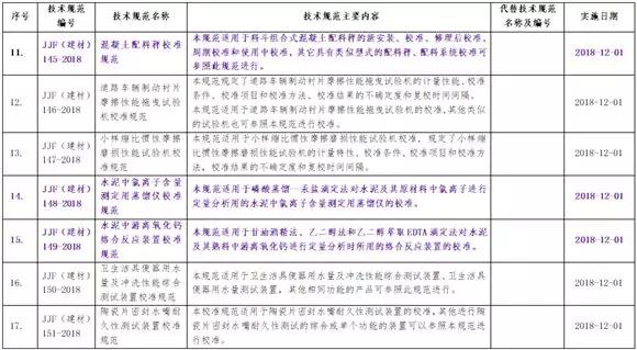 水泥行業(yè),編號JJF(建材)145-2018的混凝土配料秤校準規(guī)范、編號JJF(建材)148-2018的水泥中氯離子含量測定用蒸餾儀校準規(guī)范、編號JJF(建材)149-2018的水泥中游離氧化鈣絡合反應裝置校準規(guī)范、編號JJF(建材)155-2018的水泥凈漿馬氏流動時間自動測定儀校準規(guī)范四項校準規(guī)范被列入名單中,規(guī)范均從2018年12月1日起正式實施。