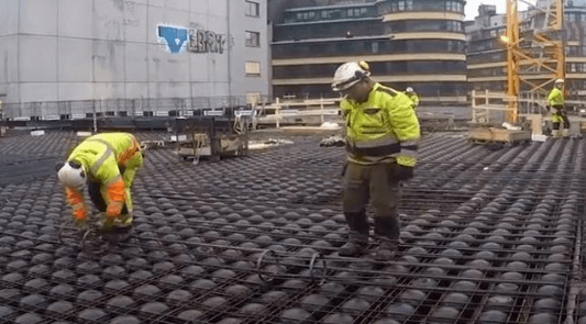 其實啊,用這種小黑球叫做“膜殼混凝土”。用它搭配著混凝土蓋房,雖然聽起來太不靠譜,不過在出了名施工嚴(yán)謹(jǐn)?shù)牡聡?,那可是非常常見的做法了。施工時直接把黑球橫平豎直排列好,然后在上面現(xiàn)澆一層薄薄的混凝土就行。