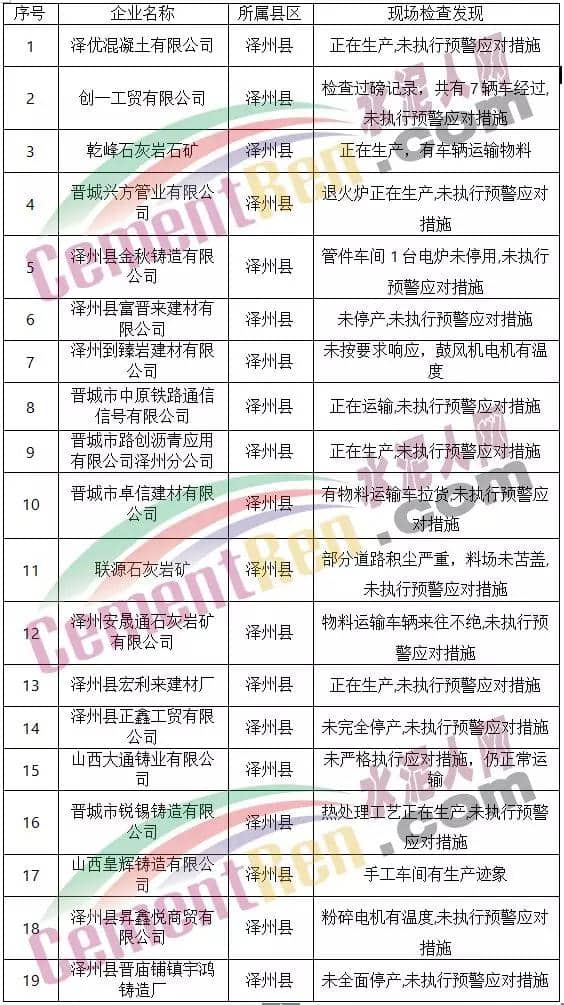 巡查發(fā)現(xiàn)的19家企業(yè),未嚴(yán)格落實(shí)重污染天氣應(yīng)急預(yù)案停產(chǎn)、限產(chǎn)、停止公路運(yùn)輸?shù)纫蟆?br />