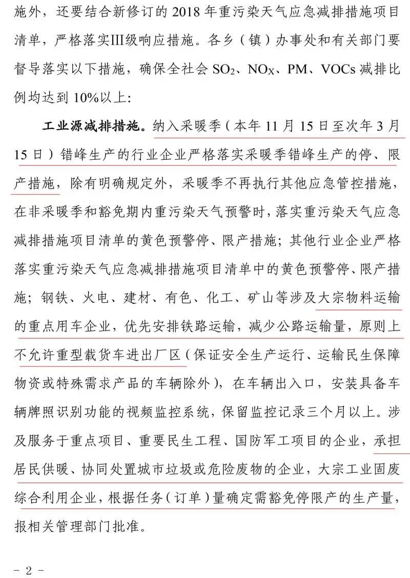 其他行業(yè)企業(yè)嚴格落實重污染天氣應急減排措施項目清單中的黃色預警停、限產(chǎn)措施;鋼鐵、火電、建材、有色、化工、礦山等涉及大宗物料運輸?shù)闹攸c用車企業(yè),優(yōu)先安排鐵路運輸,減少公路運輸量,原則上不允許重型載貨車進出廠區(qū)。承擔居民供暖、協(xié)同處置城市垃圾或危險廢物的企業(yè),大宗工業(yè)固廢綜合利用企業(yè),根據(jù)任務(訂單)量確定需豁免停限產(chǎn)的生產(chǎn)量,報相關管理部門批準。