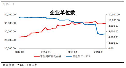 第一個(gè)解釋還需要更多的證據(jù)。關(guān)于第二個(gè)解釋?zhuān)覀冎冷撹F煤炭的去產(chǎn)能盛行于2016-2017,但水泥行業(yè)的動(dòng)作要晚,去年才頒布了《水泥行業(yè)去產(chǎn)能行動(dòng)計(jì)劃(2018~2020)》。特別的,從企業(yè)單位數(shù)這個(gè)指標(biāo)來(lái)看,水泥行業(yè)直到2017年的單位數(shù)還在增長(zhǎng),而鋼鐵、有色、化工等行業(yè)的企業(yè)單位數(shù)從2015年以來(lái)都是在下降的。因此,水泥行業(yè)的供給側(cè)改革可能導(dǎo)致幸存者偏差的問(wèn)題,使得統(tǒng)計(jì)數(shù)據(jù)高估。