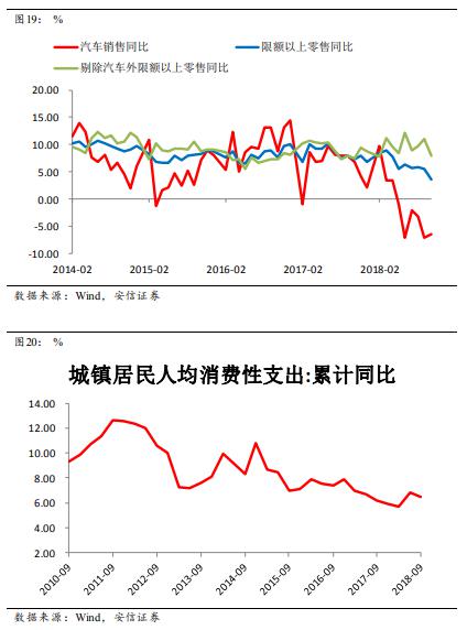 今年以來(lái)社會(huì)消費(fèi)品零售總額和限額以上零售同比下滑明顯,很大程度上是受到汽車(chē)銷(xiāo)售大幅下滑的影響。如果剔除汽車(chē)部分,限額以上零售的其他部分同比增速甚至略有上行。但10月汽車(chē)銷(xiāo)售跌幅收窄,同時(shí)限額以上零售增速明顯放緩,使得去除汽車(chē)的其他消費(fèi)出現(xiàn)了下滑。但這個(gè)下滑是否持續(xù)還需要進(jìn)一步觀察。另外,從城鎮(zhèn)居民人均消費(fèi)支出這個(gè)指標(biāo)上看,暫時(shí)沒(méi)有明顯看到消費(fèi)有大幅下滑的跡象。