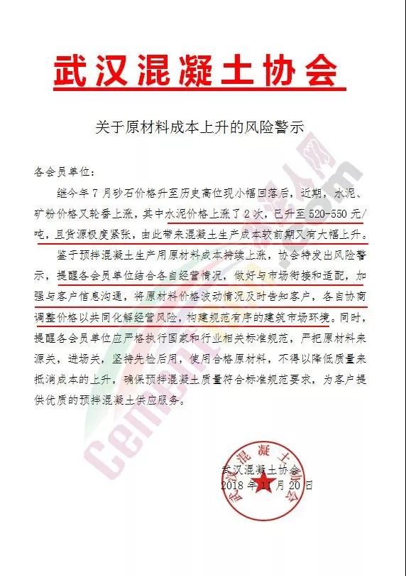 近期受水泥價(jià)格持續(xù)上漲影響,武漢混凝土協(xié)會發(fā)布預(yù)警通知:稱繼今年7月砂石價(jià)格升至歷史高位現(xiàn)小幅回落后。近期,水泥、礦粉價(jià)格又輪番上漲,其中水泥價(jià)格上漲2次,已升至520-550元/噸,且貨源極度緊張,由此帶來混凝土生產(chǎn)成本較前期又有大幅上升,鑒于預(yù)拌混凝土生產(chǎn)用原材料成本持續(xù)上漲,協(xié)會特發(fā)出風(fēng)險(xiǎn)警示提醒各會員單位結(jié)合各自經(jīng)營情況,做好與市場銜接和適配,加強(qiáng)與客戶信息溝通,將原材料價(jià)格波動(dòng)情況及時(shí)告知客戶,各自協(xié)商調(diào)整價(jià)格以共同化解經(jīng)營風(fēng)險(xiǎn),構(gòu)建規(guī)范有序的建筑市場環(huán)境。原文如下: