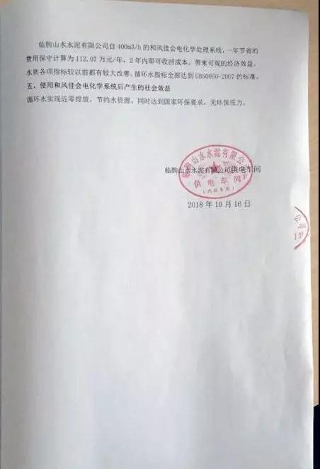 四、綜上,臨朐山水水泥有限公司自使用400m³/h的和風(fēng)佳會(huì)電化學(xué)處理系統(tǒng),一年節(jié)省的費(fèi)用約為76.76萬(wàn)元/年,帶來(lái)可觀的經(jīng)濟(jì)效益。水質(zhì)各項(xiàng)指標(biāo)較以前都有較大改善,循環(huán)水指標(biāo)全部達(dá)到GB50050-2007的標(biāo)準(zhǔn)。