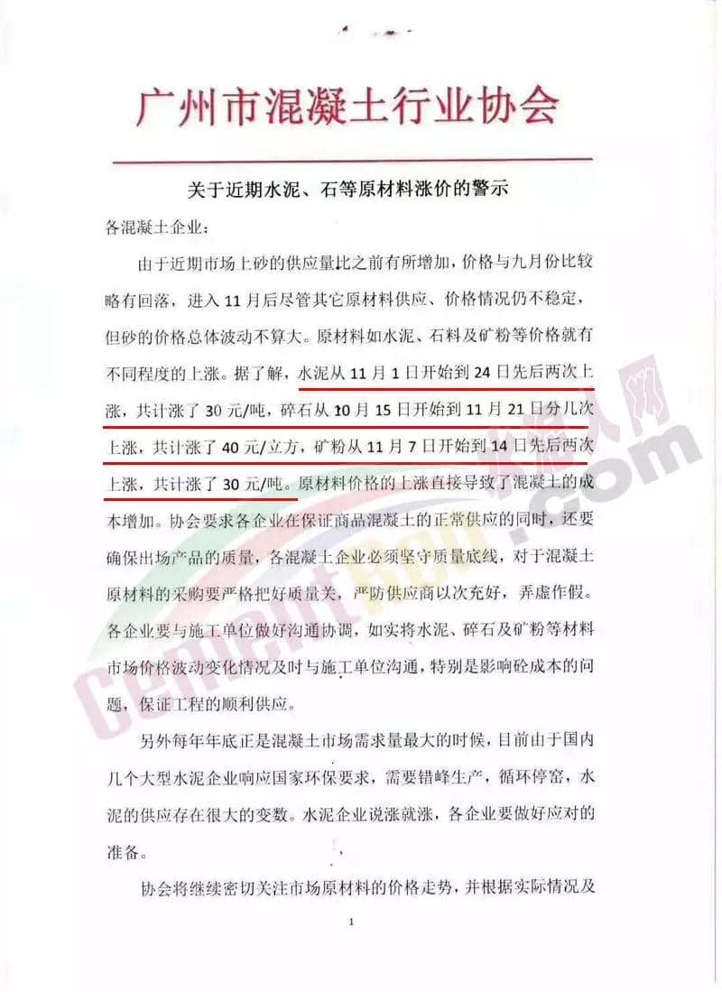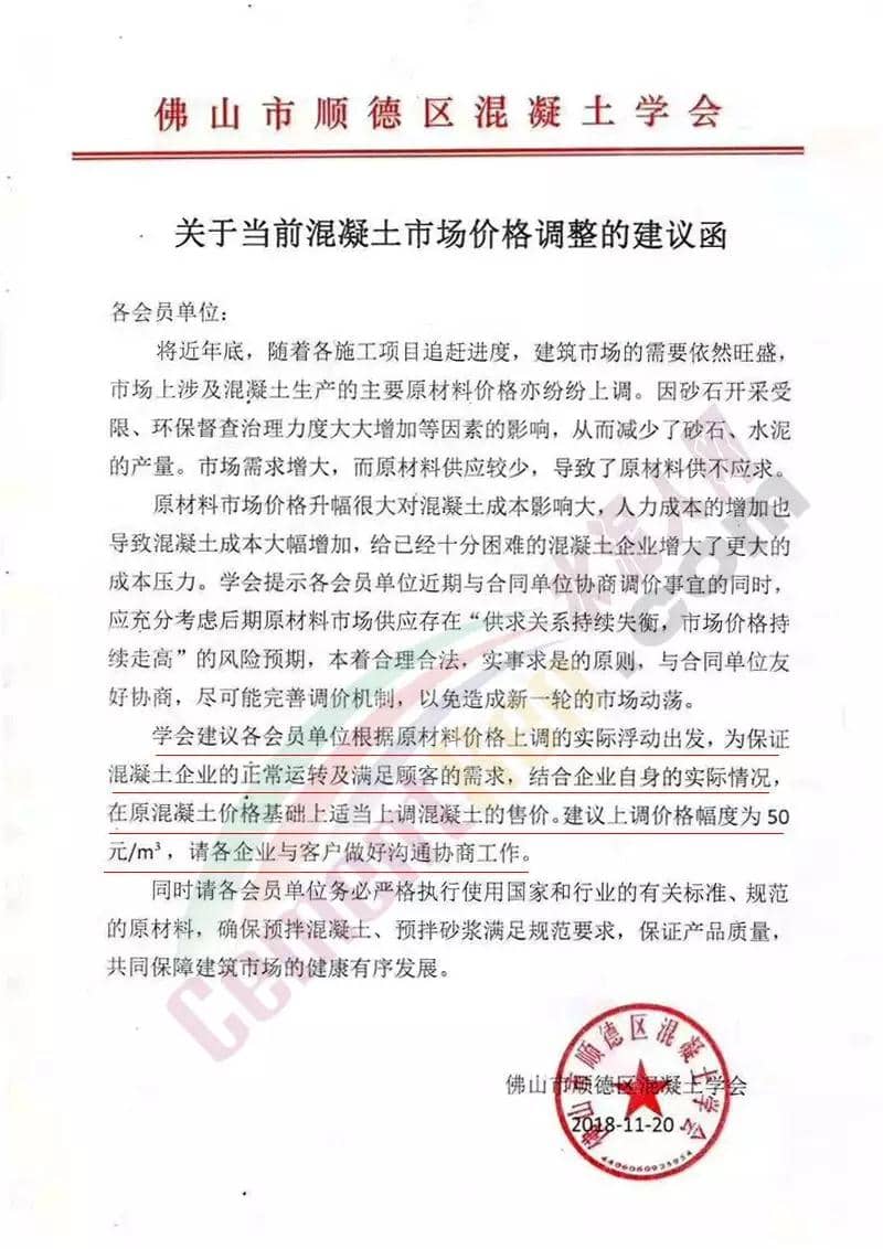 同一天,廣東省佛山市順德區(qū)混凝土學會發(fā)布了《關于當前混凝土市場價格調整的建議函》。建議函稱將近年底,隨著各項施工項目追趕進度,建筑市場的需要依然旺盛,市場上涉及混凝土生產的主要原材料價格亦紛紛上調,且供不應求,同時疊加人力成本的增加,使混凝土企業(yè)的成本壓力增大。
