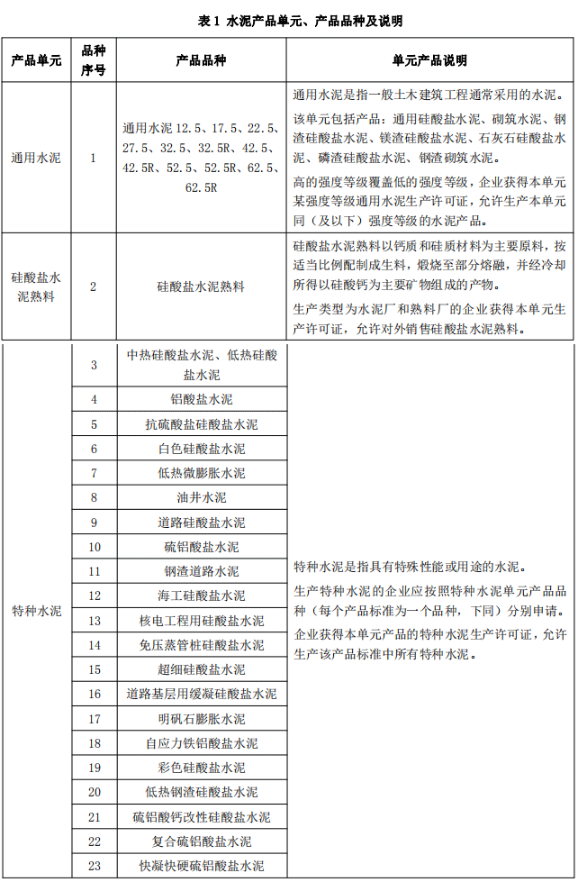 本細(xì)則規(guī)定的水泥產(chǎn)品劃分為3個(gè)產(chǎn)品單元,23個(gè)產(chǎn)品品種。水泥產(chǎn)品單元?jiǎng)澐忠?jiàn)表1。