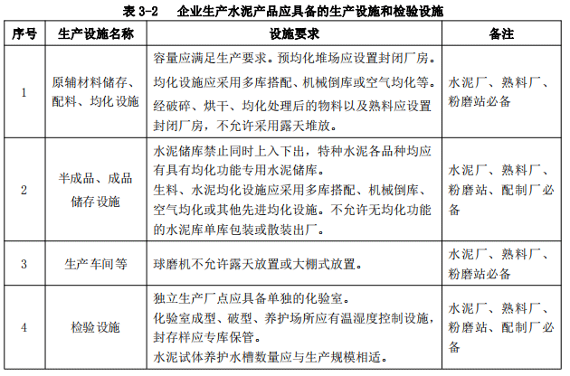 第七條 企業(yè)生產(chǎn)水泥產(chǎn)品應(yīng)具備本條款規(guī)定的基本生產(chǎn)條件,內(nèi)容包括:生產(chǎn)設(shè)施和檢驗(yàn)設(shè)施、生產(chǎn)設(shè)備和檢驗(yàn)設(shè)備,具體要求見(jiàn)表3-2至表3-4。