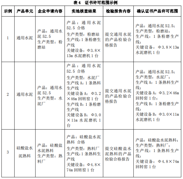 水泥產(chǎn)品生產(chǎn)許可證證書(shū)許可范圍示例如表4。