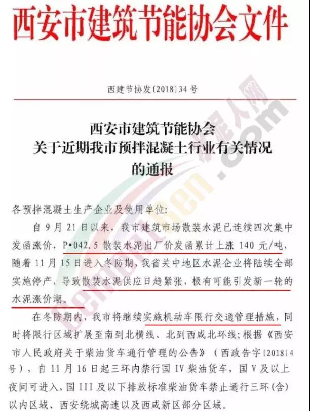 與此行情類似的是關(guān)中區(qū)域。日前,西安市建筑節(jié)能協(xié)會(huì)發(fā)布《關(guān)于預(yù)拌混凝土行業(yè)有關(guān)情況的通報(bào)》,通報(bào)稱自9月21日以來,西安市建筑市場(chǎng)散裝水泥已連續(xù)四次集中漲價(jià),累計(jì)漲幅達(dá)140元/噸。隨著11月15日進(jìn)入冬防期,陜西省關(guān)中地區(qū)水泥企業(yè)將陸續(xù)全部實(shí)施停產(chǎn),導(dǎo)致散裝水泥供應(yīng)日趨緊張,極有可能引發(fā)新一輪的水泥漲價(jià)潮。目前,關(guān)中地區(qū)不僅僅是窯企停限產(chǎn),水泥供應(yīng)日趨緊張。在冬防期內(nèi)西安市繼續(xù)實(shí)施機(jī)動(dòng)車限行交通管理措施,同時(shí)限行區(qū)域擴(kuò)大。