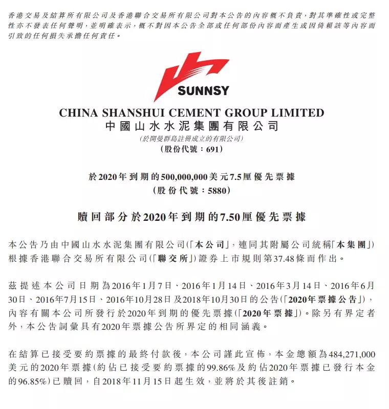 山水水泥(00691)公告,就有關(guān)于2020年到期的7.5厘優(yōu)先票據(jù),在結(jié)算已接受要約票據(jù)的最終付款后,公司宣布,本金總額為4.85億美元的2020年票據(jù)(占已接受要約票據(jù)的100%)已贖回,自2018年11月28日起生效,并將于其后注銷(xiāo)。