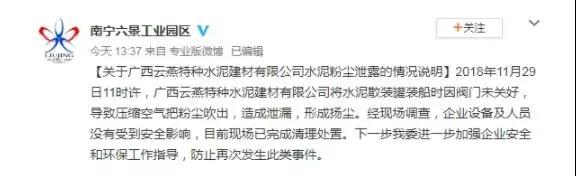 說(shuō)明指,2018年11月29日11時(shí)許,廣西云燕特種水泥建材有限公司將水泥散裝罐裝船時(shí)因閥門(mén)未關(guān)好,壓縮空氣把粉塵吹出,造成泄漏,產(chǎn)生揚(yáng)塵。經(jīng)現(xiàn)場(chǎng)調(diào)查,企業(yè)設(shè)備及人員沒(méi)有受到安全影響,目前現(xiàn)場(chǎng)已完成清理處置。