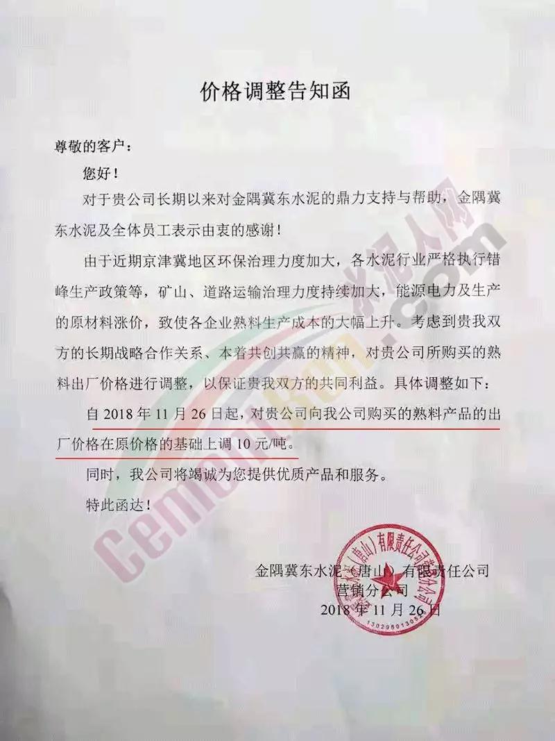 日前,華北地區(qū)主導(dǎo)企業(yè)金隅冀東水泥集中發(fā)布調(diào)價(jià)通知。其中,北京金隅經(jīng)貿(mào)有限公司調(diào)價(jià)通知稱,隨著環(huán)保治理力度不斷加大,各企業(yè)環(huán)保投入不斷增加,水泥行業(yè)開(kāi)始嚴(yán)格執(zhí)行錯(cuò)峰生產(chǎn)。同時(shí),煤炭、礦粉等價(jià)格持續(xù)走高,導(dǎo)致水泥成本不斷提高。企業(yè)將于12月1日起上調(diào)各生產(chǎn)企業(yè)的所有水泥產(chǎn)品出廠價(jià)格,上調(diào)幅度30元/噸。