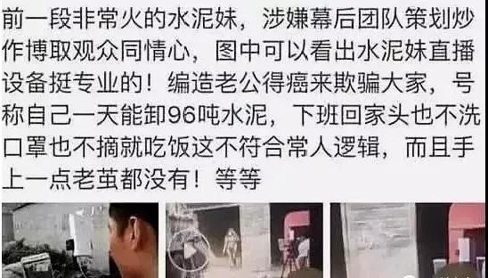 直播相信大家每個人都看過,也有很多的網(wǎng)紅都是靠著直播平臺來賺錢的。同時直播平臺也火了一大批人,我們今天說的就是這樣一個團(tuán)隊,靠著直播賣慘來博取觀眾的眼球,從而攫取流量來獲得利益。相信大家都知道水泥妹這個人,他們這個團(tuán)隊就是靠拍攝一個瘦弱的女子在工地上抬水泥來養(yǎng)活家庭,從而博取關(guān)注。