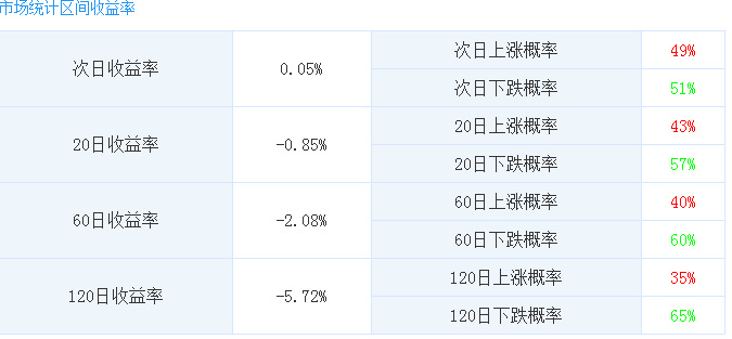 統(tǒng)計2016年2月1日至2018年5月31日的全市場數(shù)據(jù),東方財富Choice數(shù)據(jù)顯示,共有2741只個股有效突破年線9374次,其中4590次突破后次日股價上漲,4784次股價下跌,全市場次日平均收益率為0.05%。若將持有期拉長,一個月(20日)、三個月(60日)、六個月(120日)平均收益率分別為-0.85%、-2.08%、-5.72%。