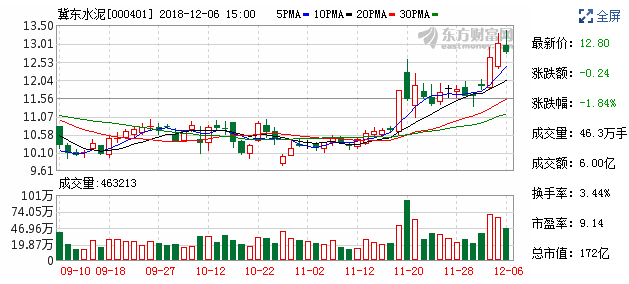 12月6日,冀東水泥A股開盤12.99元,全日下跌1.84%,股價收報12.80元。自12月4日以來,冀東水泥股價有效突破年線(250日均價),收盤價連續(xù)三日收于年線之上,3日乖離率為7.83%。