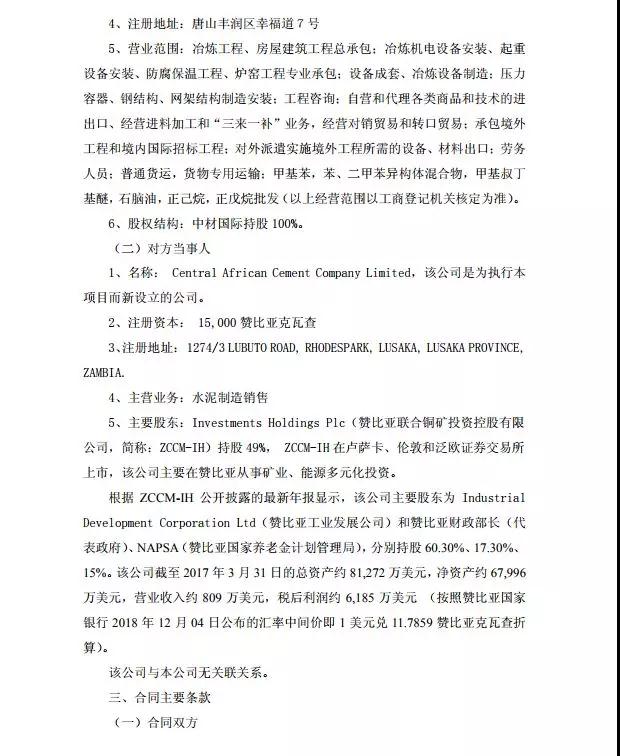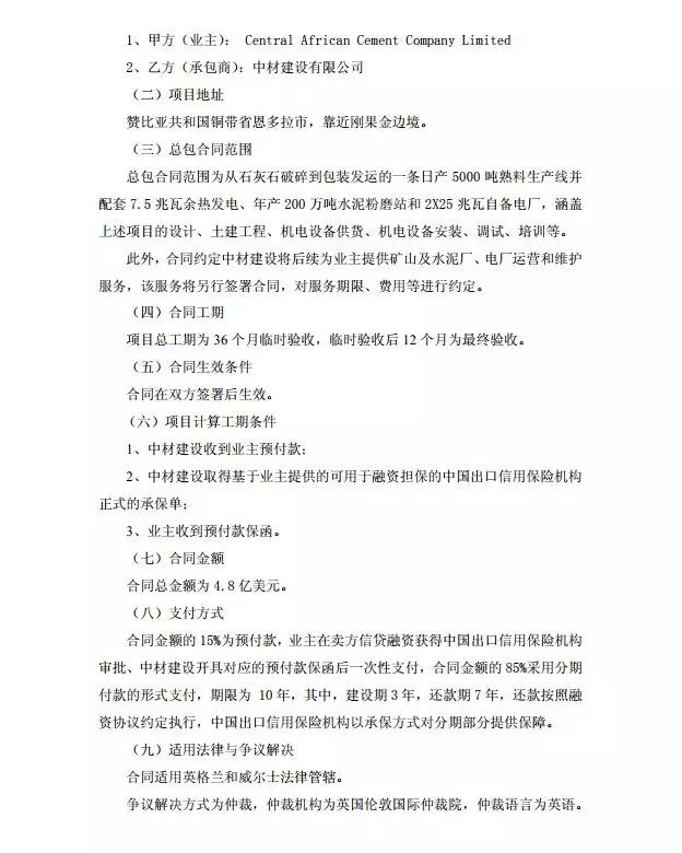 昨日(12月6日)上市公司中材國際(600970.sh)發(fā)布公告稱,旗下全資子公司中材建設(shè)有限公司(下稱“中材建設(shè)”)與中非水泥有限公司(即CentralAfricanCementCompanyLimited,下稱“業(yè)主")簽訂了《中非水泥有限公司日產(chǎn)5000噸水泥熟料生產(chǎn)線及配套7.5兆瓦余熱發(fā)電、年產(chǎn)200萬噸水泥粉磨站和2X25兆瓦熱電廠項目總承包合同》及《融資協(xié)議》,總承包合同金額為4.8億美元。