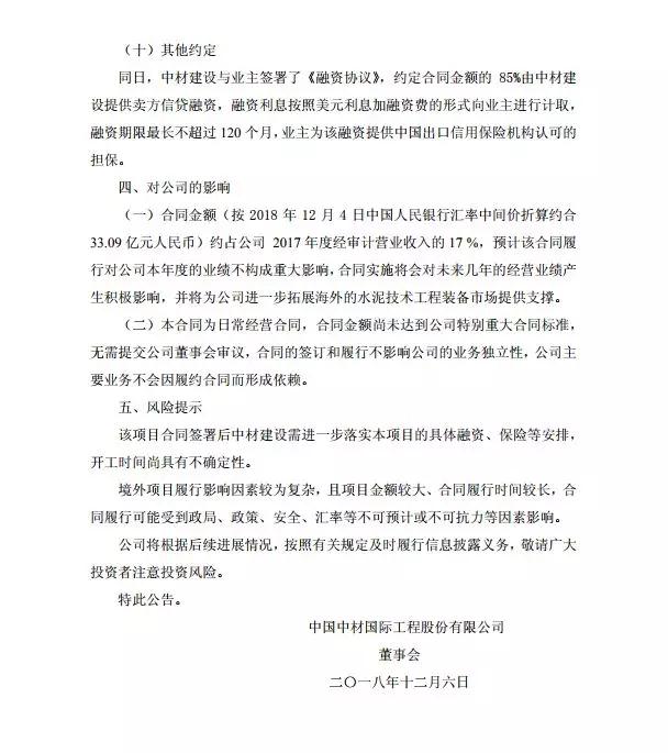 公告稱,合同還約定中材建設(shè)將后續(xù)為業(yè)主提供礦山及水泥廠、電廠運營和維護(hù)服務(wù),該服務(wù)將另行簽署合同,對服務(wù)期限、費用等進(jìn)行約定。合同金額(按2018年12月4日中國人民銀行匯率中間價折算約合33.09億元人民幣)約占公司2017年度經(jīng)審計營業(yè)收入的17%,預(yù)計該合同的實施將會對未來幾年的經(jīng)營業(yè)績產(chǎn)生積極影響,并將為公司進(jìn)一步拓展海外的水泥技術(shù)工程裝備市場提供支撐。