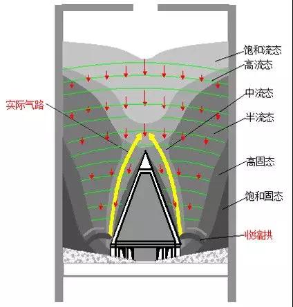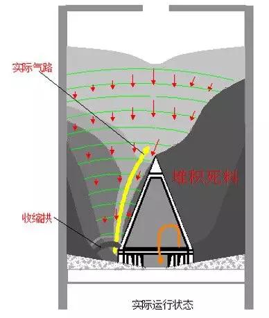 無(wú)論新庫(kù)還是重新清庫(kù)后的存儲(chǔ),事實(shí)其料路發(fā)展都像立雞蛋易倒一般,極易形成不斷自我放大的多點(diǎn)氣路偏移聚合作用(中部多股分散漏斗流),如圖4所示。最后必然發(fā)展形成少數(shù)單點(diǎn)料路日益增長(zhǎng)發(fā)展的對(duì)應(yīng)死料偏庫(kù)現(xiàn)象,遠(yuǎn)非人們自以為是氣路鋪設(shè)布局不均,氣箱磨損失效,庫(kù)壁及減壓錐面不光滑,人員操作不當(dāng)?shù)鹊仍颉?/p>