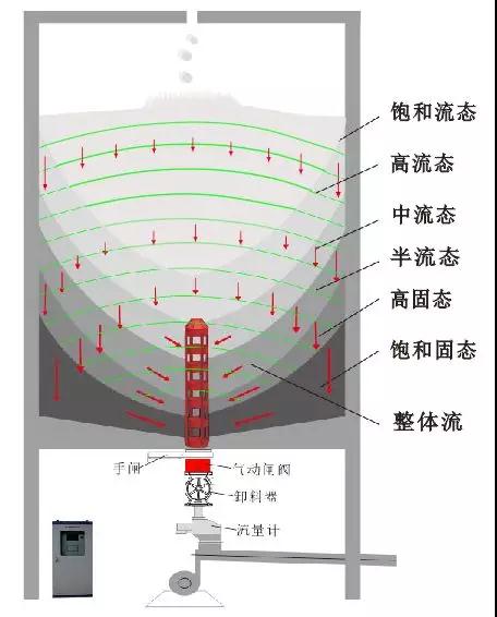 歷經(jīng)多年的研究與試驗(yàn),昆明艾克自動(dòng)化公司發(fā)現(xiàn)了重力拱作用會(huì)形成庫(kù)壁高密度硬料聚集層疊加效應(yīng),從而確定庫(kù)壁及底部硬料是死料形成的溫床。只有讓環(huán)庫(kù)壁及底部硬料均衡優(yōu)先卸放流動(dòng),才可形成整體流,進(jìn)而徹底消除庫(kù)壁水分滲漏、凝析凝析引發(fā)的嚴(yán)重粘連、板結(jié)、固化,同時(shí)還應(yīng)考慮形成料位偏移的自動(dòng)糾偏作用,在庫(kù)底則應(yīng)重點(diǎn)持續(xù)破解出口上方因粉料同時(shí)向心匯聚而在水平與垂直方向形成的動(dòng)態(tài)收縮拱阻礙。