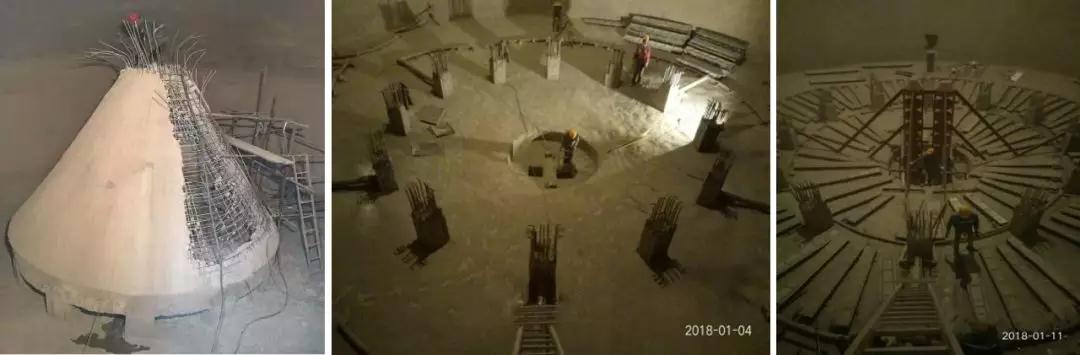 而我們采用東方易經(jīng)的太極思維,要充分利用庫(kù)內(nèi)存料的巨大原重力下壓作為推動(dòng)力,為此我們針對(duì)性發(fā)明設(shè)計(jì)了無(wú)動(dòng)力鋼結(jié)構(gòu)太極錐;使其在出口上方形成陰陽(yáng)交錯(cuò)的多層破拱導(dǎo)流作用,可同時(shí)破除水平方向和垂直方向的向心收縮拱,并通過由低到高硬中軟的分層進(jìn)料排序設(shè)計(jì)自然形成環(huán)形庫(kù)壁硬料優(yōu)先的合理安排。如此這般,便巧妙產(chǎn)生了與庫(kù)內(nèi)料密度硬軟分布相匹配的動(dòng)力學(xué)設(shè)計(jì),一旦庫(kù)位發(fā)生偏移失衡,高出部位產(chǎn)生的料重力差將形成自動(dòng)正比例的糾偏推力,實(shí)現(xiàn)自主收斂性糾偏修正調(diào)節(jié),最終可實(shí)現(xiàn)環(huán)庫(kù)全料整體流自平衡卸放,如圖6所示。