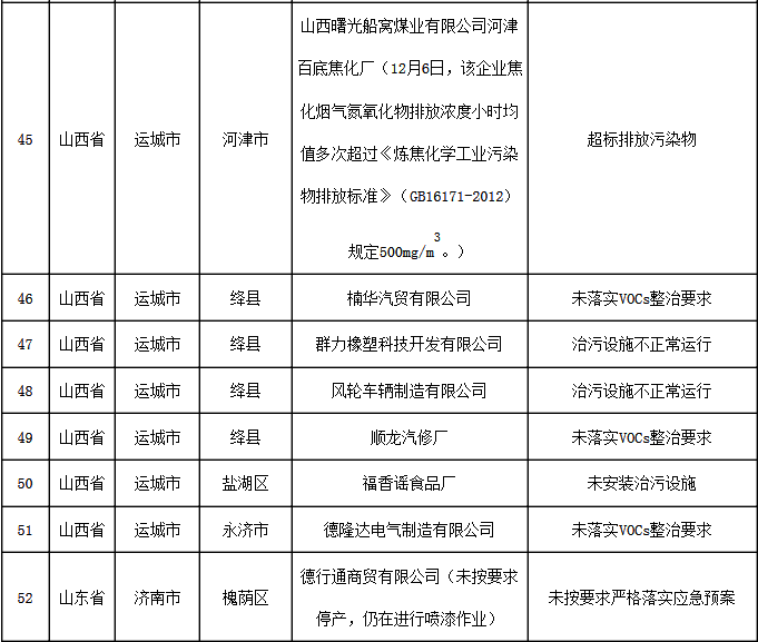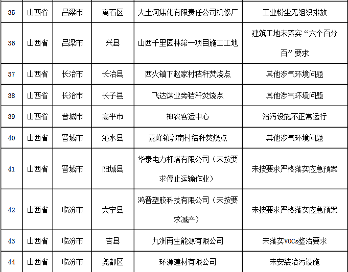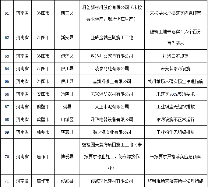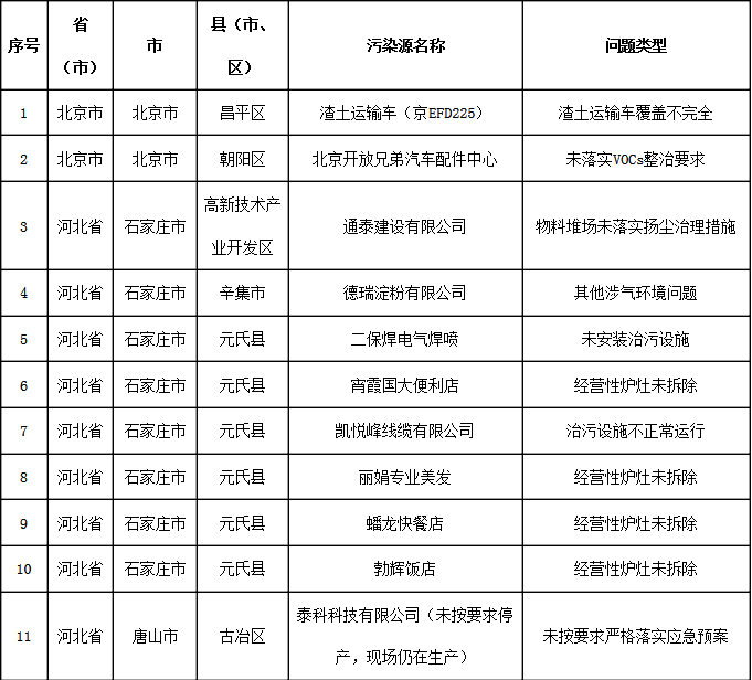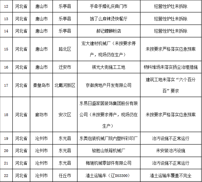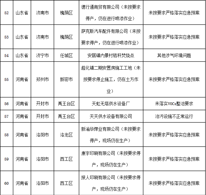 2018-2019年藍天保衛(wèi)戰(zhàn)重點區(qū)域強化監(jiān)督工作繼續(xù)開展,12月15日工作組發(fā)現涉氣環(huán)境問題71個,12月16日工作組發(fā)現未嚴格執(zhí)行重污染天氣應急響應問題16個(見附表)。
