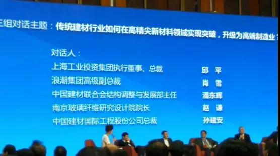 上海工業(yè)投資(集團)有限公司執(zhí)行董事、總裁邱平,浪潮集團高級副總裁、中國檢驗檢測學會質量鏈工作委員會主任肖雪、中材高新材料股份有限公司總裁張偉儒、南京玻纖院董事長趙謙、蚌埠玻璃工業(yè)設計研究院常務副院長馬立云就“傳統(tǒng)建材如何在高精尖新材料領域實現(xiàn)突破,推動建材行業(yè)升級為高端制造業(yè)”交換了意見。