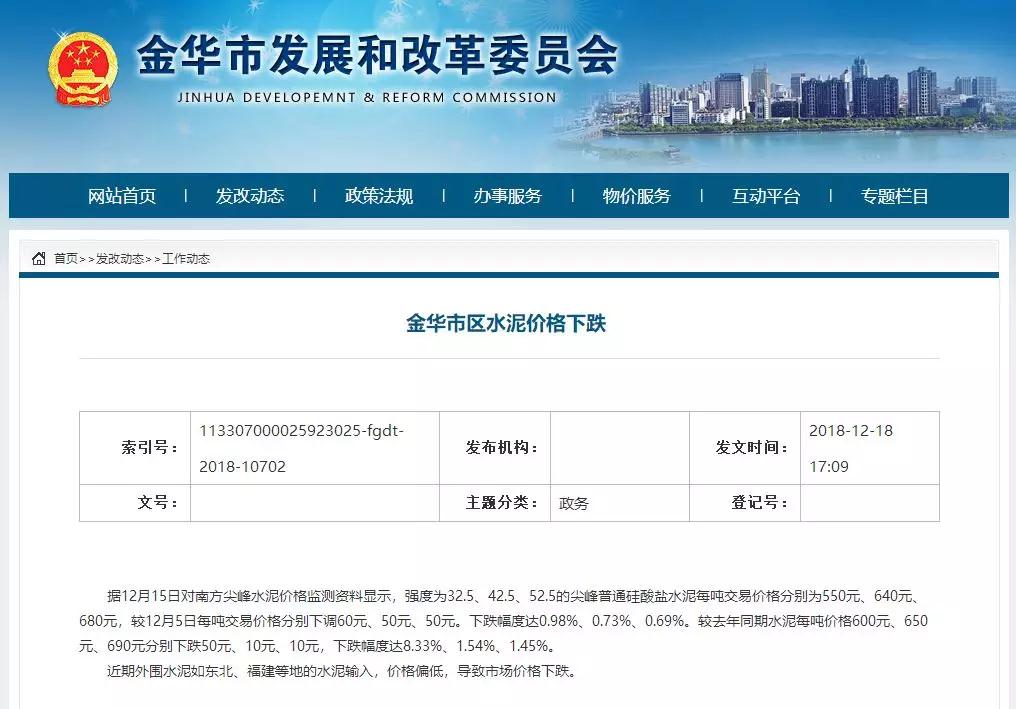 同期浙江金華的水泥價格也出現(xiàn)了下跌。