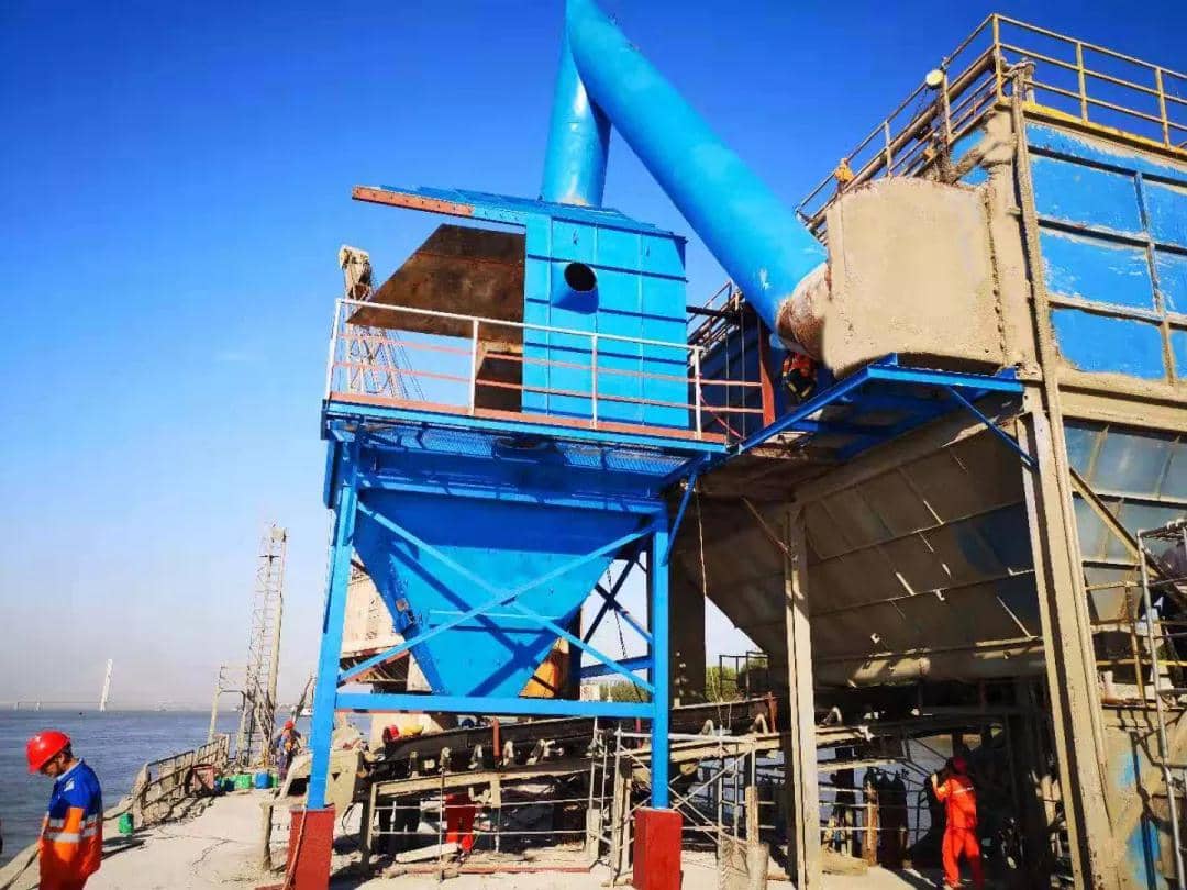 公司水泥原材料熟料、石膏、碎石均從長(zhǎng)江船運(yùn)至自有的散貨碼頭進(jìn)廠,利用躉船吊機(jī)用抓斗從運(yùn)輸船里抓起散狀物料,提至約10米高處卸到特定料斗,料斗下面為帶式輸送機(jī)。此作業(yè)方式物料落差大,加上未設(shè)計(jì)安裝收塵設(shè)備,吊料時(shí)造成的揚(yáng)塵很大。