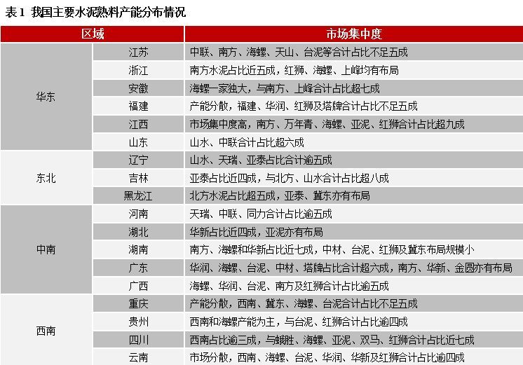 華東、東北地區(qū)市場集中度高,西南和華北地區(qū)市場集中度較低。華東和東北地區(qū)市場集中度較高,海螺水泥(600585,股吧)、南方水泥、中聯(lián)水泥、山水水泥及紅獅水泥在華東地區(qū)市場占有率較高,東北市場主要受北方水泥、亞泰集團(600881,股吧)、山水水泥和天瑞水泥主導(dǎo);中南和西北地區(qū)集中度一般,海螺水泥、南方水泥、華新水泥(600801,股吧)、天瑞水泥、中聯(lián)水泥、華潤水泥、臺泥水泥及同力水泥(000885,股吧)是中南地區(qū)主要水泥供應(yīng)商,天山水泥、祁連山(600720,股吧)、寧夏建材(600449,股吧)及西部水泥是西北地區(qū)地方龍頭水泥企業(yè),冀東水泥(000401,股吧)及海螺水泥介入產(chǎn)能較大;西南和華北地區(qū)市場集中度較低,西南水泥在西南地區(qū)市場占有率高,但臺泥水泥、海螺水泥、紅獅水泥亦是區(qū)域主要的市場競爭者,華北地區(qū)除金隅冀東外,其余水泥產(chǎn)能分散。