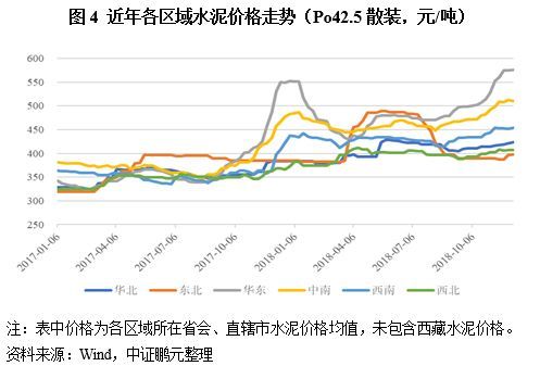 華東、中南地區(qū)水泥高位運行,“三北”地區(qū)水泥價格較低。華東及中南地區(qū)水泥需求旺盛,價格持續(xù)處于高位,錯峰生產(chǎn)由北向南推廣,水泥價格持續(xù)上揚,以Po42.5散裝水泥為例(下同),2018年11月以來各省份價格均創(chuàng)2017年以來新高,其中浙江、江蘇價格已破600元/噸,湖南、廣州及廣西漲幅相對較小,主要系市場分散、競爭相對充分所致。西南地區(qū)重慶及四川水泥價格明顯上漲,云南及貴州剔除季節(jié)性因素,價格變化不大。“三北”地區(qū)受困于產(chǎn)能過剩、競爭激烈,水泥價格整體處于低位,東北地區(qū)因季節(jié)性擾動價格短暫處于高位,遼寧市場集中度低、競爭較劇,價格整體處于東三省低位;華北地區(qū)“京津冀”受益于集中度提高及錯峰生產(chǎn),水泥價格漲幅較大,但內(nèi)蒙古及山西增幅有限;西北地區(qū)陜西2018年11月以來水泥價格破500元/噸,青海及新疆漲幅有限,甘肅及西寧價格處于低位,2018年11月以來不高于350元/噸。