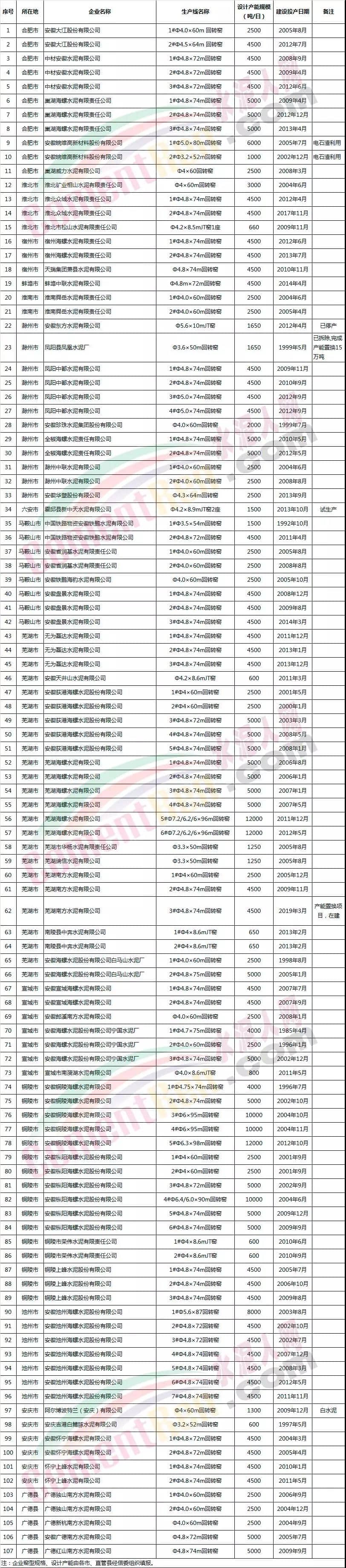 部分安徽省水泥企業(yè)名單
