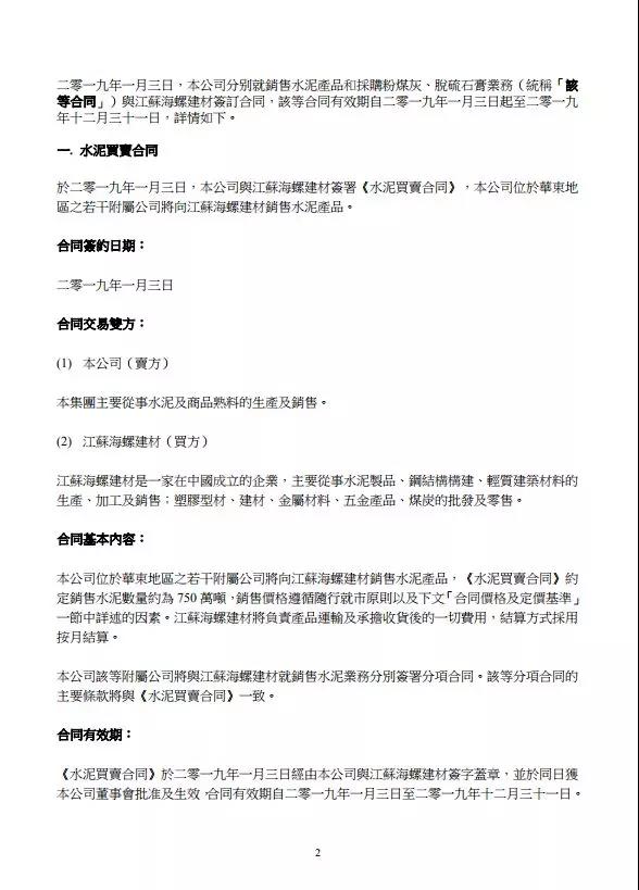 同日,公司與江蘇海螺建材簽署《物資采購(gòu)合同》,根據(jù)《物資采購(gòu)合同》,公司位于上海區(qū)域的3家附屬公司將向江蘇海螺建材采購(gòu)粉煤灰及脫硫石膏,合同有效期自2019年1月3日至2019年12月31日,預(yù)估總交易金額約為不多于人民幣2120萬(wàn)元。