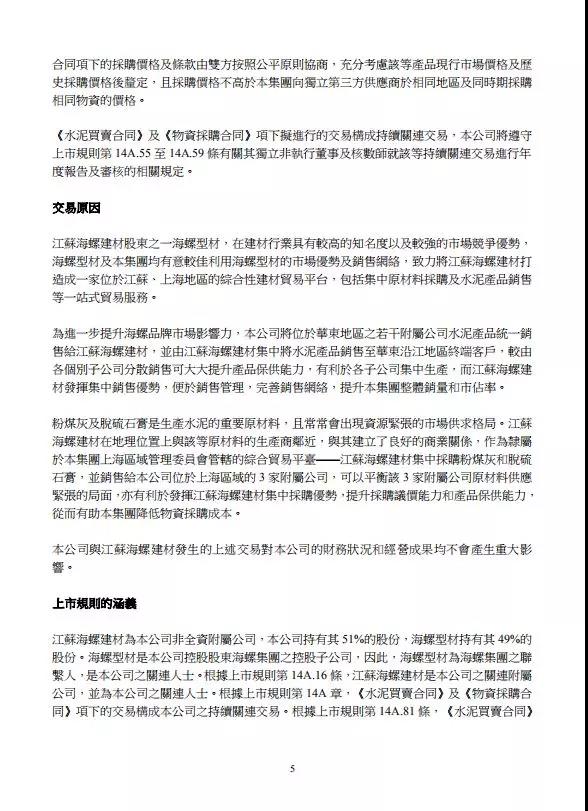 根據(jù)上市規(guī)則第14A.16條,江蘇海螺建材是公司關(guān)連附屬公司,并為公司關(guān)連人士。根據(jù)上市規(guī)則第14A章,《水泥買賣合同》及《物資采購(gòu)合同》項(xiàng)下的交易構(gòu)成公司持續(xù)關(guān)連交易。