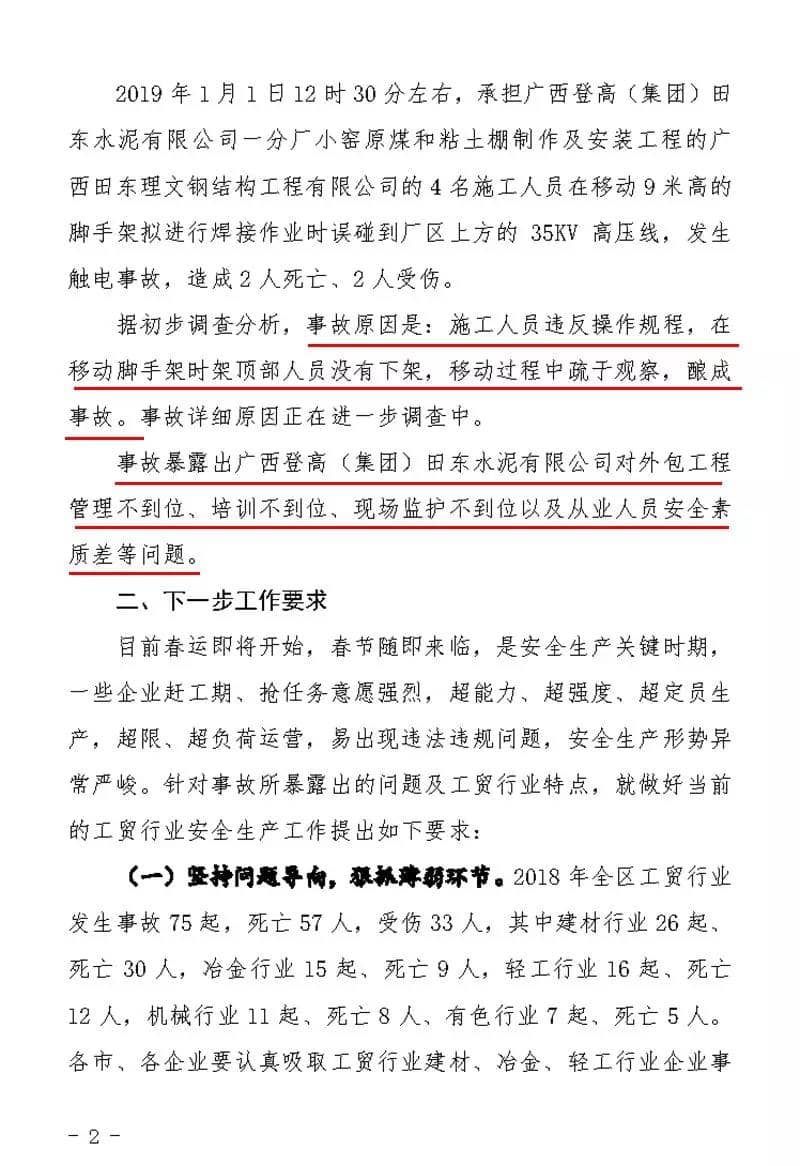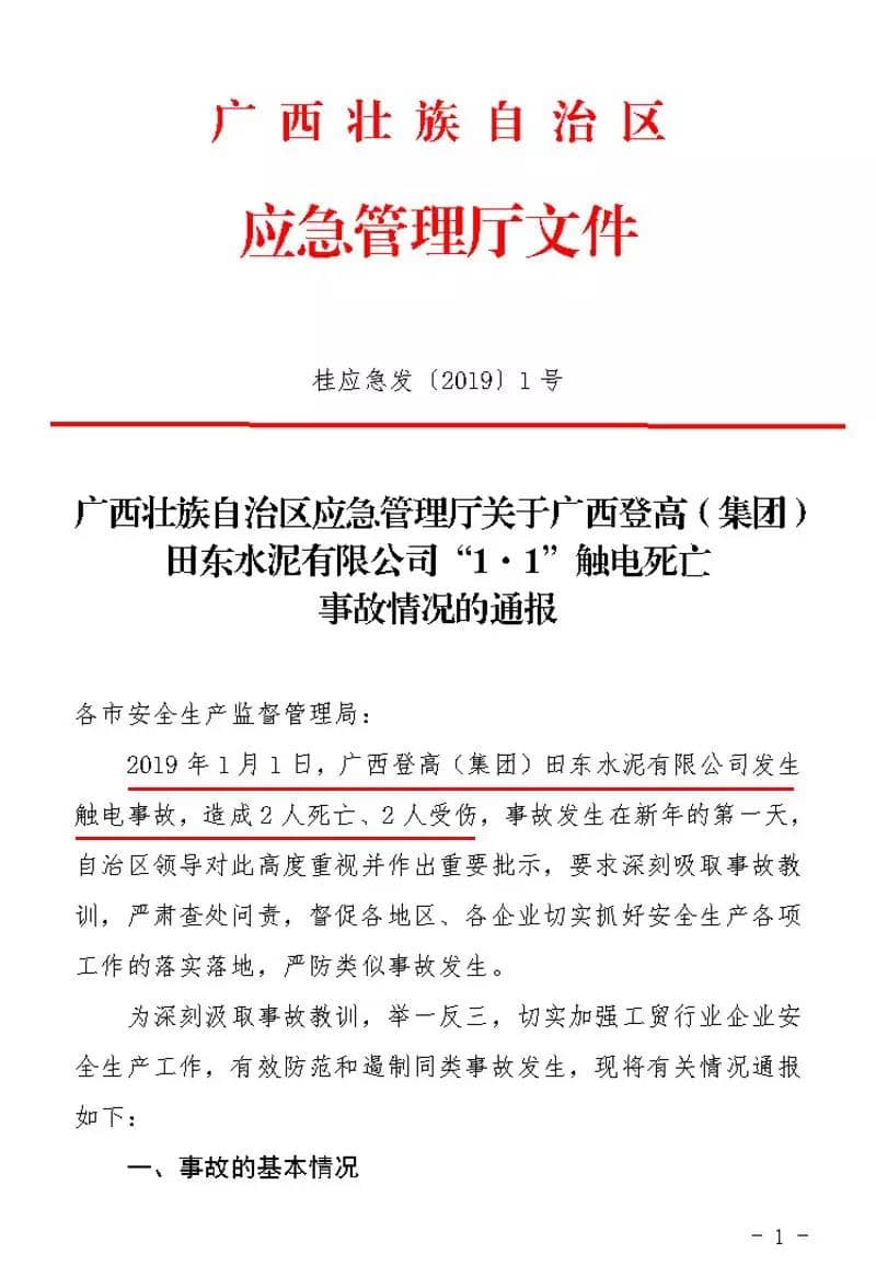 附:廣西壯族自治區(qū)應(yīng)急管理廳關(guān)于廣西登高(集團)田東水泥有限公司“1_1”觸電死亡事故情況的通報