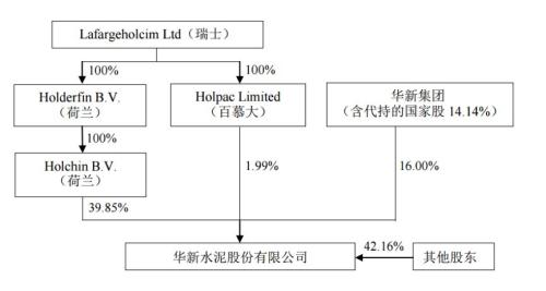 截至2018年9月30日,拉法基豪瑞集團(tuán)旗下全資子公司Holchin.B.V.在公司的持股比例為 39.85%,其與一致行動人合計持股41.84%。以下為公司債券跟蹤評級報告(2018)中披露的股權(quán)結(jié)構(gòu)圖: