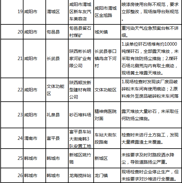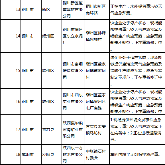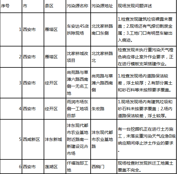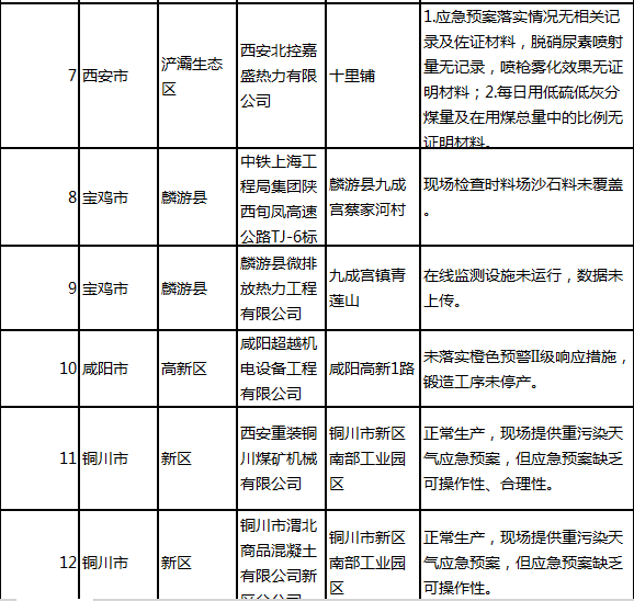 為進一步督促關(guān)中8市(區(qū))嚴(yán)格執(zhí)行重污染天氣應(yīng)急預(yù)案,切實落實各項應(yīng)急減排措施,緩解重污染天氣影響,省生態(tài)環(huán)境廳成立10個檢查組,重點對相關(guān)市(區(qū))重污染天氣應(yīng)急預(yù)案落實情況、涉氣排污企業(yè)達標(biāo)排放情況、“散亂污”企業(yè)清理取締情況、燃煤鍋爐拆改、揚塵污染管控、機動車尾氣治理等情況進行了執(zhí)法檢查,1月14日共發(fā)現(xiàn)問題30個(詳見表格)。所有問題已于當(dāng)日反饋給各市(區(qū))政府,督促嚴(yán)肅查處,盡快整改到位?,F(xiàn)對發(fā)現(xiàn)的問題予以公布。