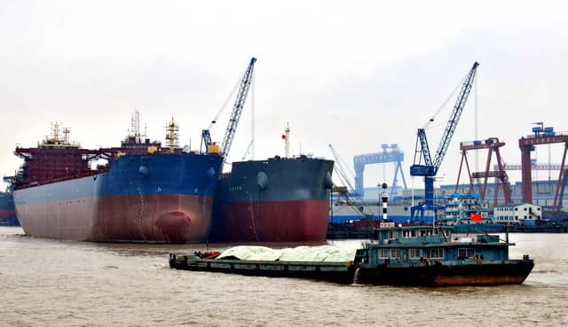 長(zhǎng)江南京段江面上航行的船舶。攝影/章軻