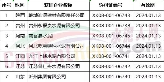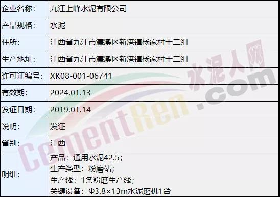 本期發(fā)放的水泥企業(yè)生產(chǎn)許可證涉及海螺水泥、南方水泥、金隅冀東、山水水泥、蒙西水泥、萬年青水泥、亞泰水泥、亞東水泥、上峰水泥等企業(yè)及其子公司。其中九江上峰水泥有限公司為新發(fā)證書。