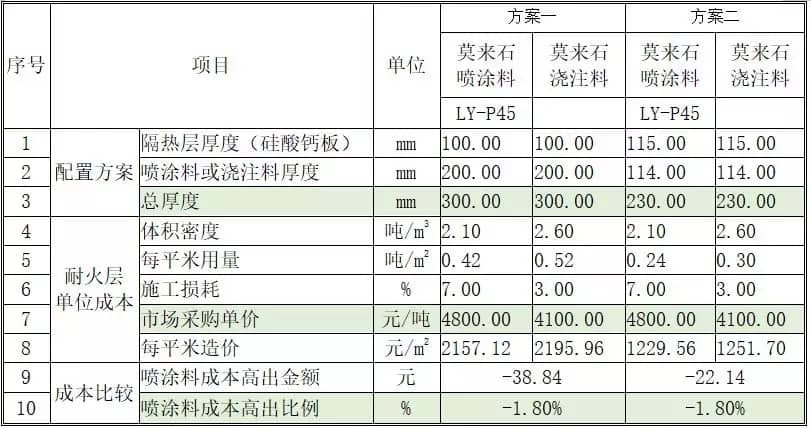 使用傳統(tǒng)澆注料和噴涂料的成本比較表: