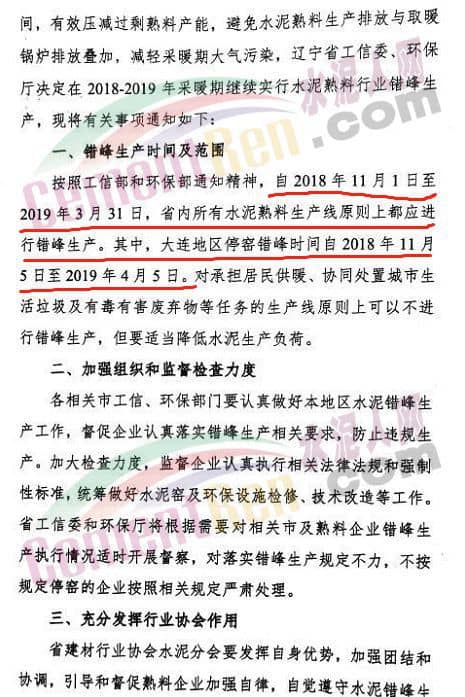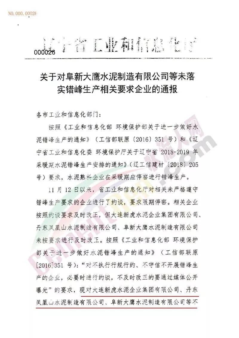 2018年11月10日遼寧省工信廳曾對大鷹水泥等企業(yè)未落實錯峰生產(chǎn)相關(guān)要求企業(yè)做出公開通報,通報原文如下: