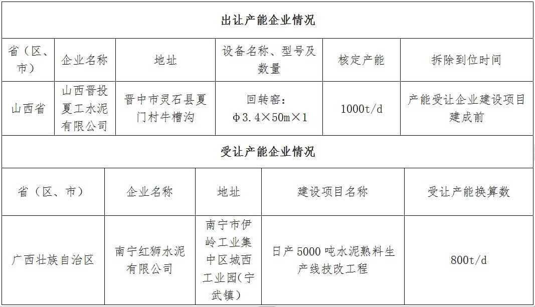 上述公告提到,山西晉投夏工水泥有限公司出讓800t/d水泥產(chǎn)能給于廣西南寧紅獅水泥有限公司用于新建日產(chǎn)5000噸水泥熟料生產(chǎn)線技改工程。