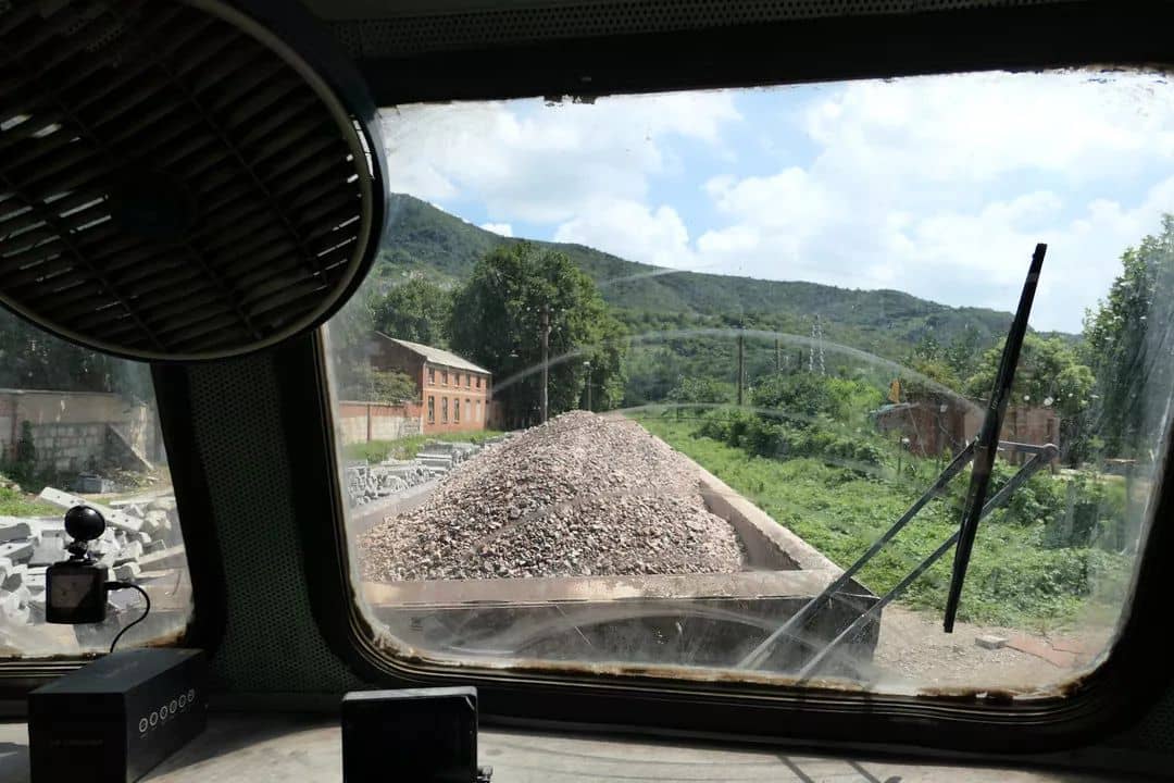 裝載貨物的車廂是俗稱“老K車”的自卸翻斗車,車廂上部的料斗在安裝于車底架兩側(cè)的氣缸的作用下可以向一側(cè)翻起,卸下石料。這些“老K車”9節(jié)為一組,掛在機(jī)車后面,將從湖山礦開(kāi)采出的石料運(yùn)往龍?zhí)稄S。