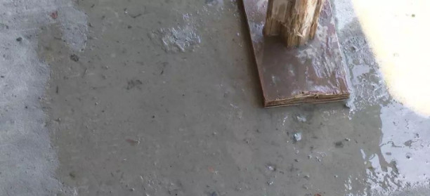 在現(xiàn)場,尹先生用手指在水泥地面上左右擦動,擦動的地方不僅會凹進去,還有小顆粒產(chǎn)生,而澆上水后,水泥地面上冒起了小泡泡。
