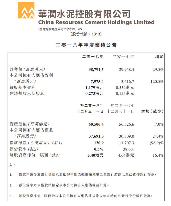 華潤水泥控股(01313.HK)公布,截至2018年12月31日止年度,實現(xiàn)營業(yè)額387.92億港元,同比增加29.5%;毛利154.20億港元,同比增加67.05%,毛利率由去年同期的30.8%增至39.8%;公司擁有人應占盈利79.75億港元,同比增加120.5%;每股基本盈利1.179港元;擬派末期股息每股0.273港元。