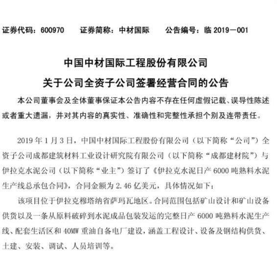 2019年1月3日,中國中材國際工程股份有限公司(以下簡稱“公司”)全資子公司成都建筑材料工業(yè)設(shè)計研究院有限公司(以下簡稱“成都建材院”)與伊拉克水泥公司(以下簡稱“業(yè)主”)簽訂了《伊拉克水泥日產(chǎn)6000噸熟料水泥生產(chǎn)線總承包合同》,合同金額為2.46億美元。合同約定,合同生效后26個月出熟料,合同生效后37個月達(dá)標(biāo)達(dá)產(chǎn)。